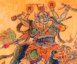 託 月 , 持 鉞 斧 , 握 金 鐘 , 持 方 天 畫 戟 , 持 印 , 騎 著 金 龍 。 於 商 末 下